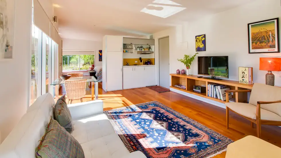 The Pavilion is situated in a secluded corner of the property and just a short walk away from the lively village of Havelock North. Designed by one of New Zealand's top architects, Pete Bossley, the Pavilion is a beautiful example of studio living with a spacious feel. We are pet friendly and have a shared swimming pool located just 50 meters away. We also offer regular yoga classes at our onsite studio a little further down the drive.